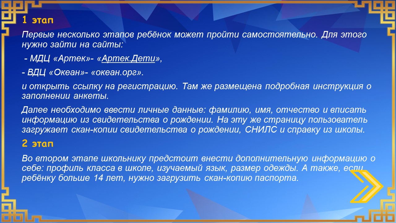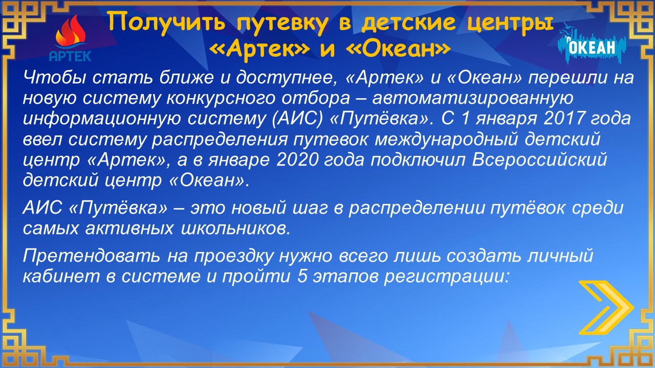 Получить путевку в детские центры «Орленок», «Смена», «Артек» и «Океан».